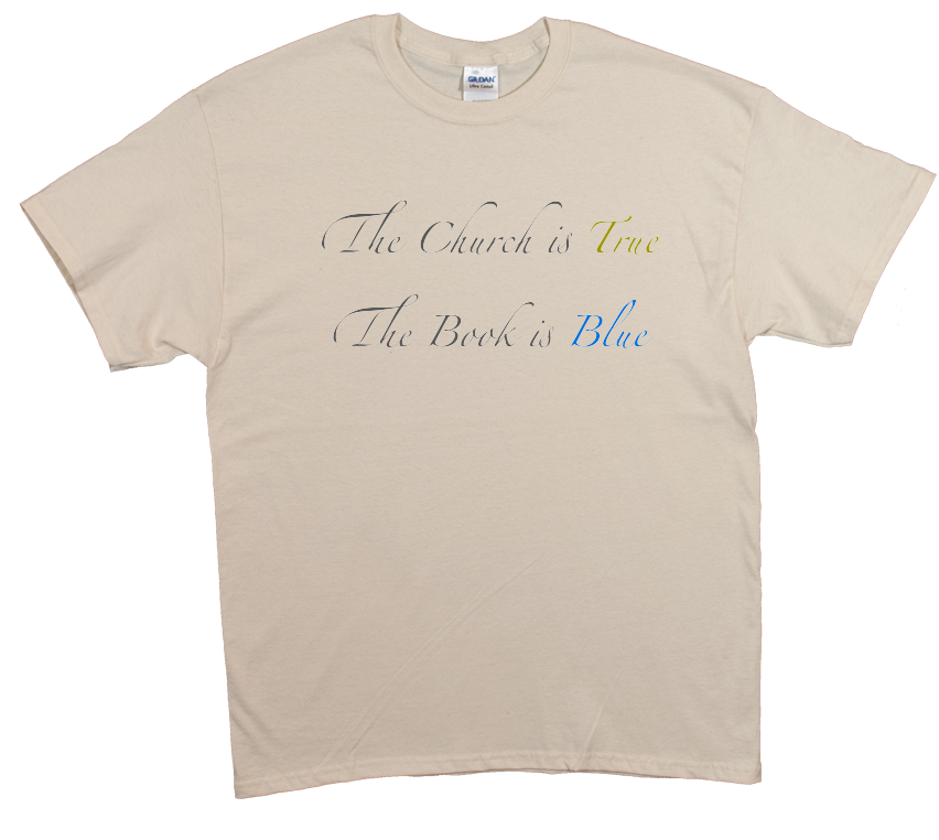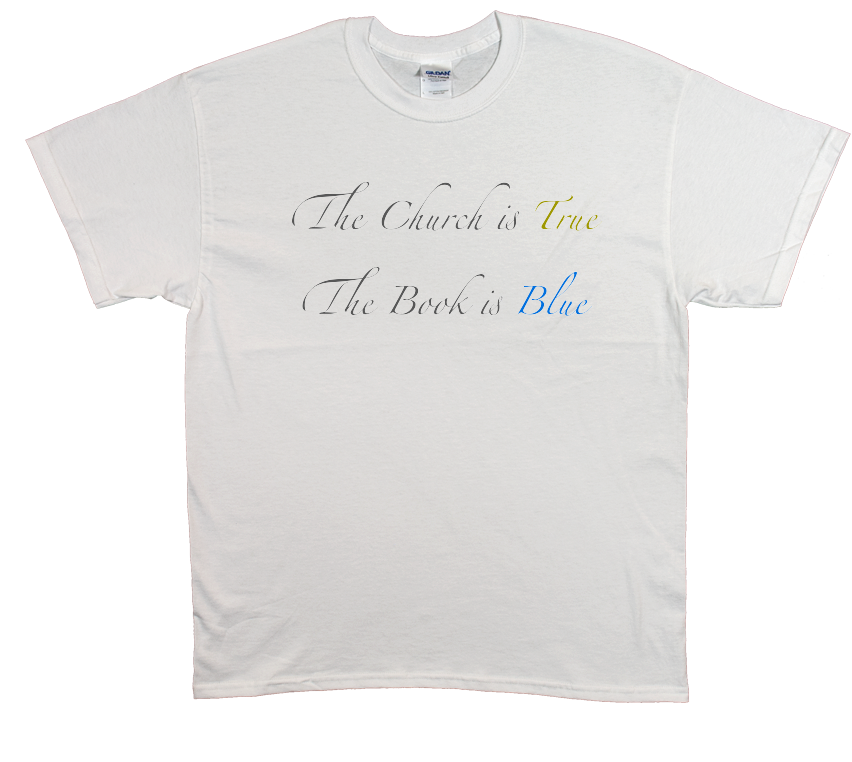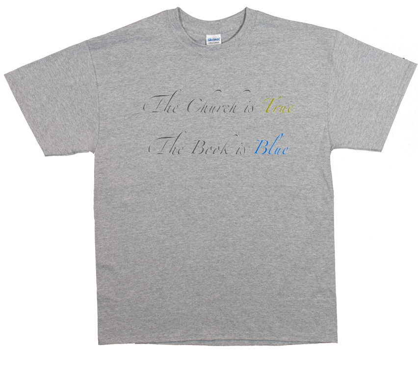 The shirt that started it all! Get our classic "Church is True, Book is Blue" t-shirt in four timeless colors. Size and fit is unisex and printed on Gildan 100% cotton shirts. (size info)